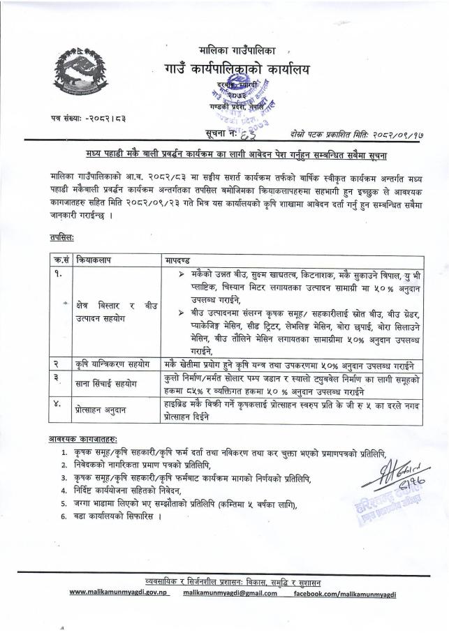 मध्य पहाडी मकै बाली प्रवर्ध्दन कार्यक्रमका लागि आवेदन पेश गर्नुहुन सम्बन्धित सबैमा सूचना ।।। (दोस्रो पटक प्रकाशित)