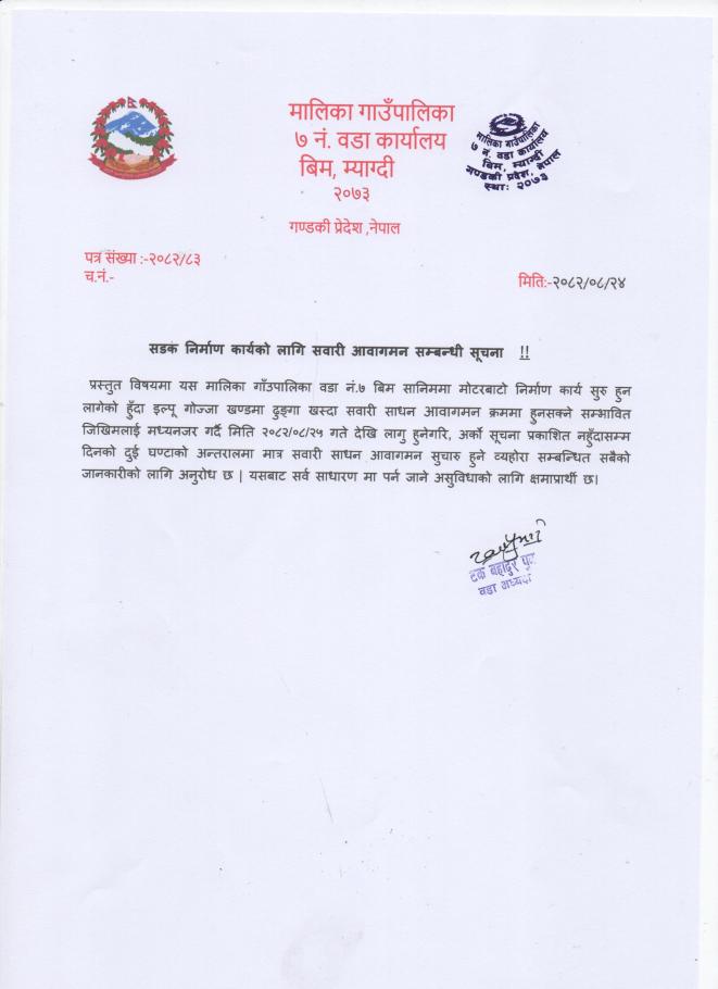 सडक निर्माण कार्यको लागि सवारी आवागमन सम्बन्धी सूचना ।।।