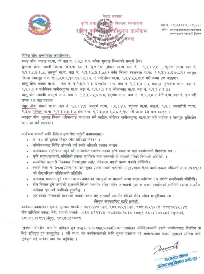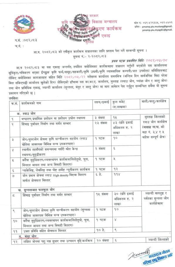 राष्ट्रिय कृषि आधुनिकीकरण कार्यक्रम, कार्यक्रम कार्यान्वयन एकाइ, मुस्ताङ अन्तर्गत आ.व. २०८२/०८३ को स्वीकृत कार्यक्रम सञ्चालनका लागि प्रस्ताव पेश गर्ने सम्बन्धी सूचना ।।