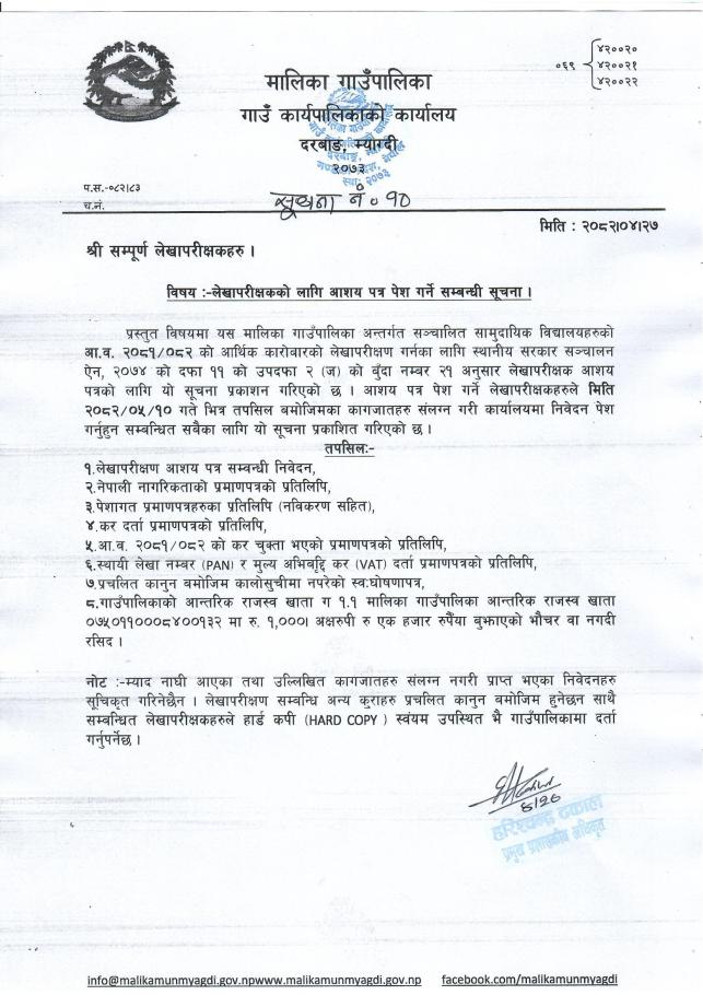 लेखा परीक्षकको लागि आशय पत्र पेश गर्ने सम्बन्धी सूचना ।।