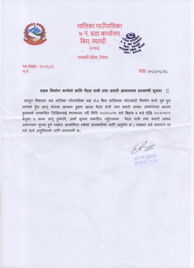 सडक निर्माण कार्यको लागि पैदल यात्री तथा सवारी आवागमन सम्बन्धी सूचना ।।
