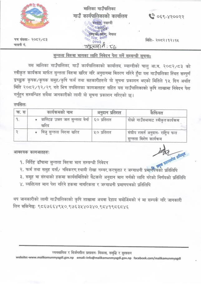 सुन्तला विरुवा मागका लागि निवेदन पेश गर्ने सम्बन्धी सूचना ।।